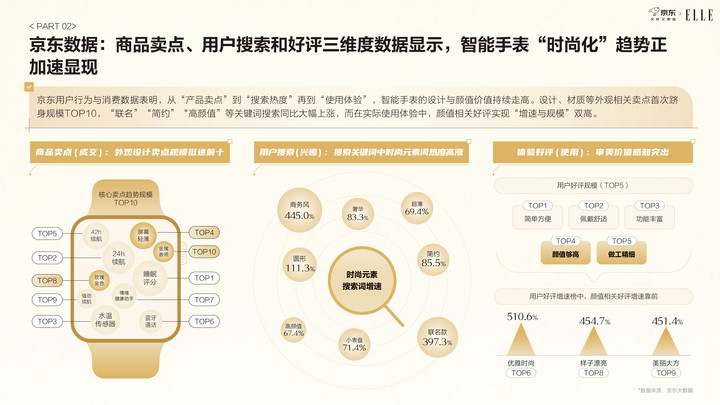 ——京东数据显示,设计与颜值成为智能手表关键卖点,在搜索、购买及使用评价中出现频次不断提升。商务风(同比增速445%)、“简约”(同比增速85.5%)、“高颜值”(同比增速67.4%)等时尚关键词搜索同比增速爆发;设计、材质等卖点首次进入商品卖点规模TOP10;对智能手表颜值的相关好评规模也进入前五。