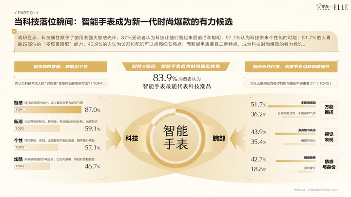 在研究洞察之外,京东还邀请了时尚媒体《ELLE》从生活方式与风格语境出发,对智能手表在不同人群与场景下的穿搭趋势进行延伸解读,呈现智能手表六大流行趋势。此外,“零点智感”“荒野时区”“能量胶囊”“逆时甜心”“赛博时差”“东方流光”具体内容详见白皮书。